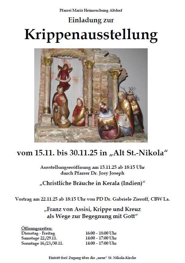 Die Pfarrei Mariä Heimsuchung Altdorf lädt herzlich zur diesjährigen Krippenausstellung in der Kirche „Alt St. Nikola“ ein. Entdecken Sie die Vielfalt der Krippenkunst – von traditionell bis modern, aus verschiedenen Regionen und Materialien gestaltet. Jede Krippe erzählt auf ihre Weise von der frohen Botschaft der Weihnacht.