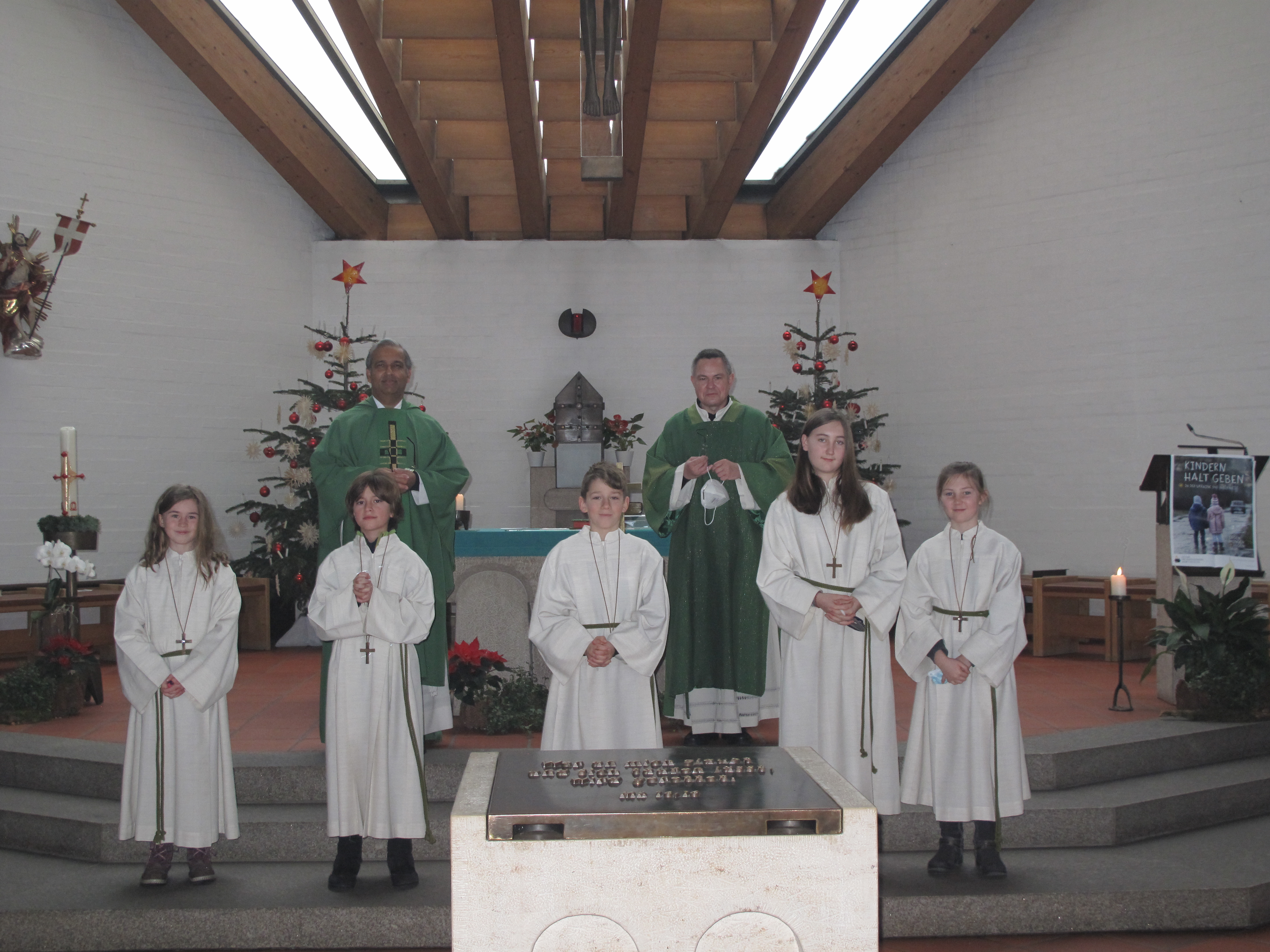 Im Oktober hatten die für den Ministranten-Dienst bereiten Kinder ihre Erstkommunion gefeiert. Da derzeit keine Gruppenstunden möglich sind, wird die Vorbereitung für den Ministranten-Dienst nachgeholt. Die neuen Ministranten Sebastian Borszcz, Julia Klein und Manuel Schlaffer gehen jetzt sozusagen bei den Großen in die Lehre, stellte Michael Weigl fest. Weiter bekräftigte er die Wichtigkeit dieses Dienstes. Der Diakon Diakon dankte daher den Eltern für ihre Unterstützung. Zum Abschluss sprach auch noch Pfarrer Dr. Josy Joseph ein Segensgebet.