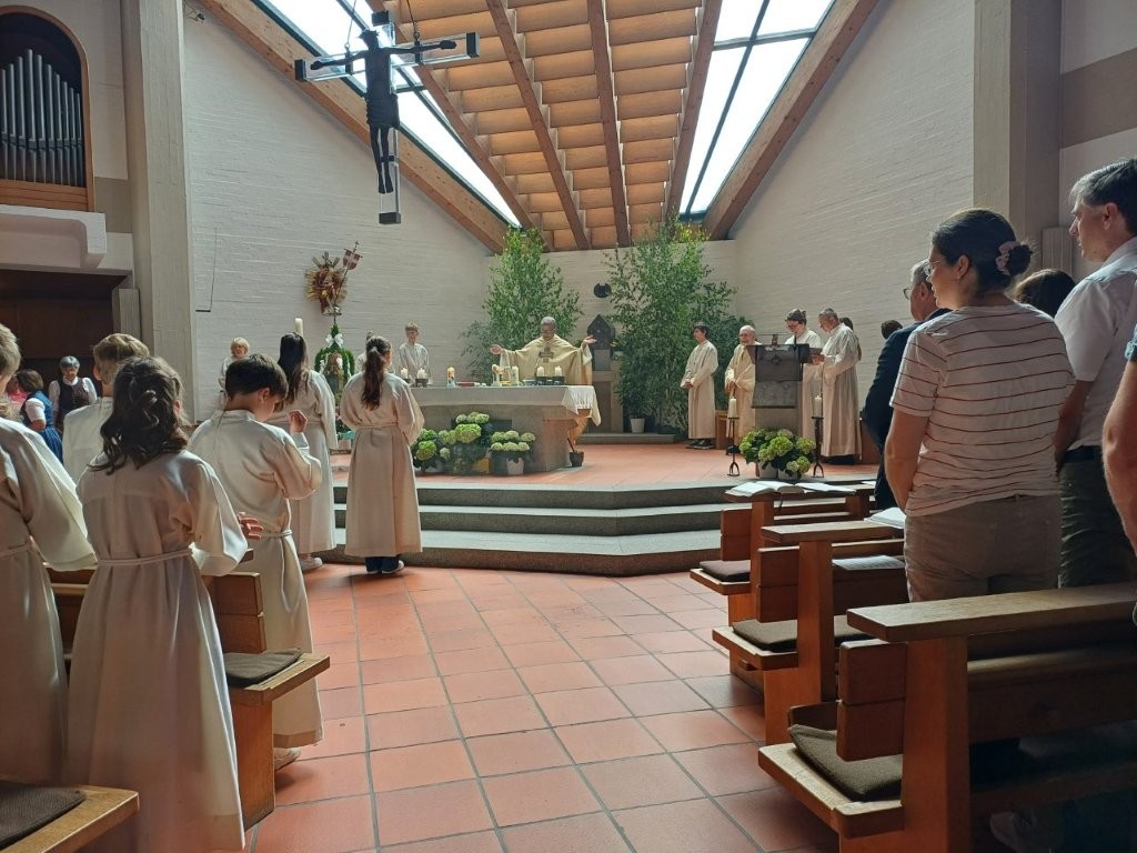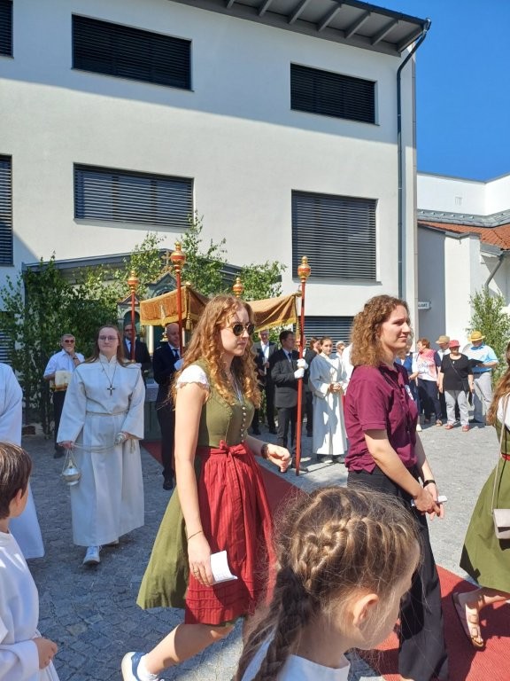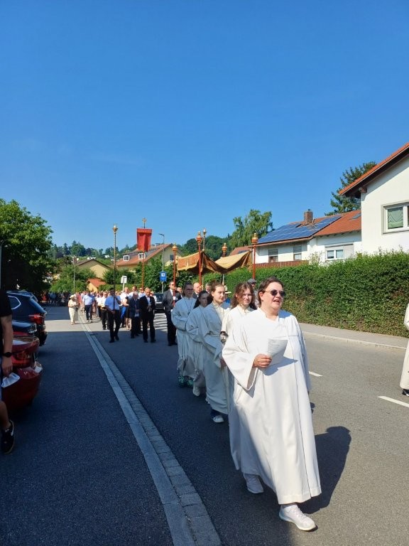 Bei strahlendem Sonnenschein und sommerlichen Temperaturen zogen zahlreiche Gläubige der Pfarrei Altdorf bei der diesjährigen Fronleichnamsprozession durch den Ort. Die feierliche Eucharistie findet dabei ihre Fortsetzung in der Prozession, bei der das Allerheiligste – getragen in der Monstranz – durch die Straßen unserer Gemeinde getragen wird. Begleitet wurde es unter anderem von den diesjährigen Erstkommunionkindern in ihren festlichen Gewändern.