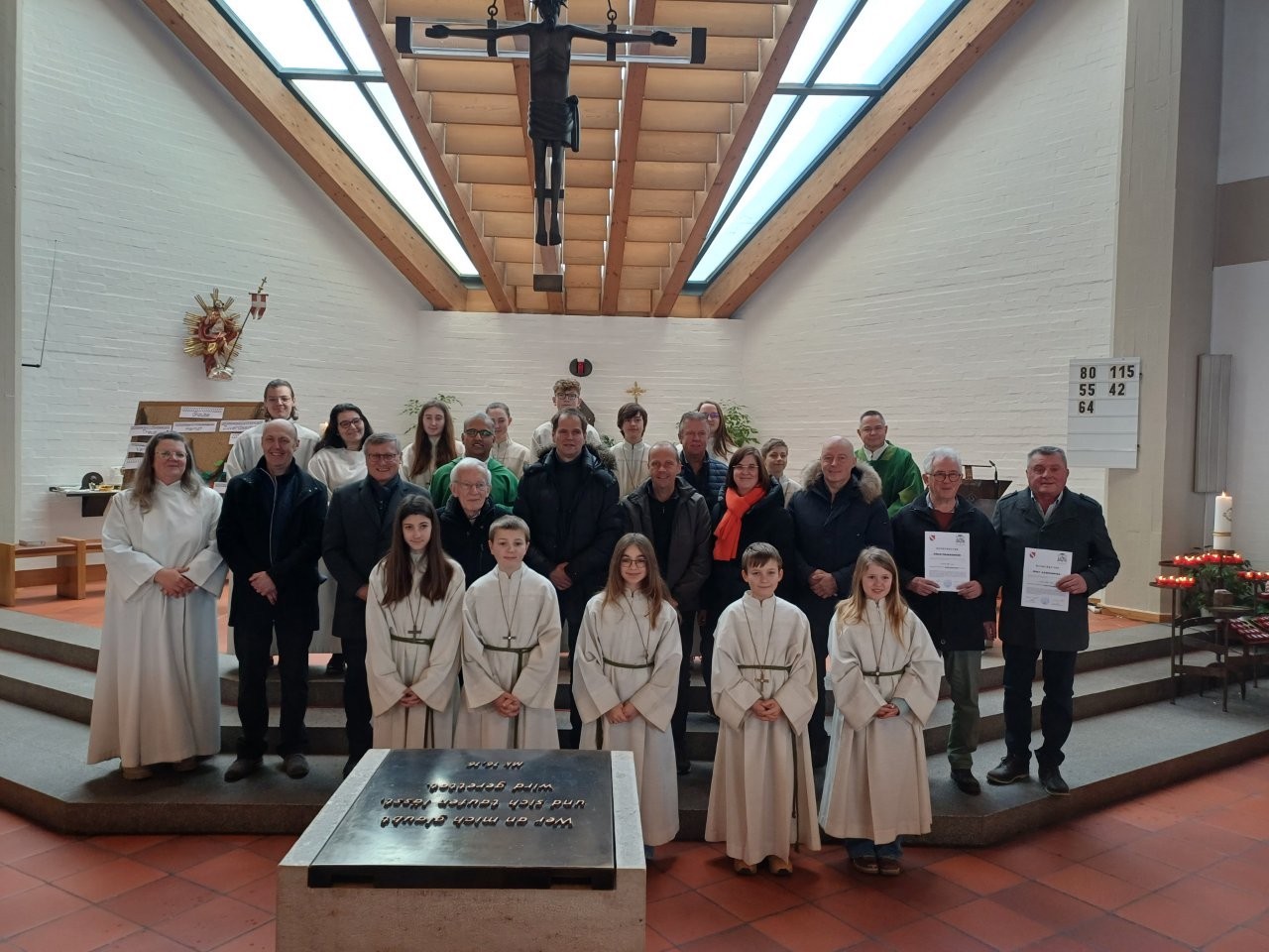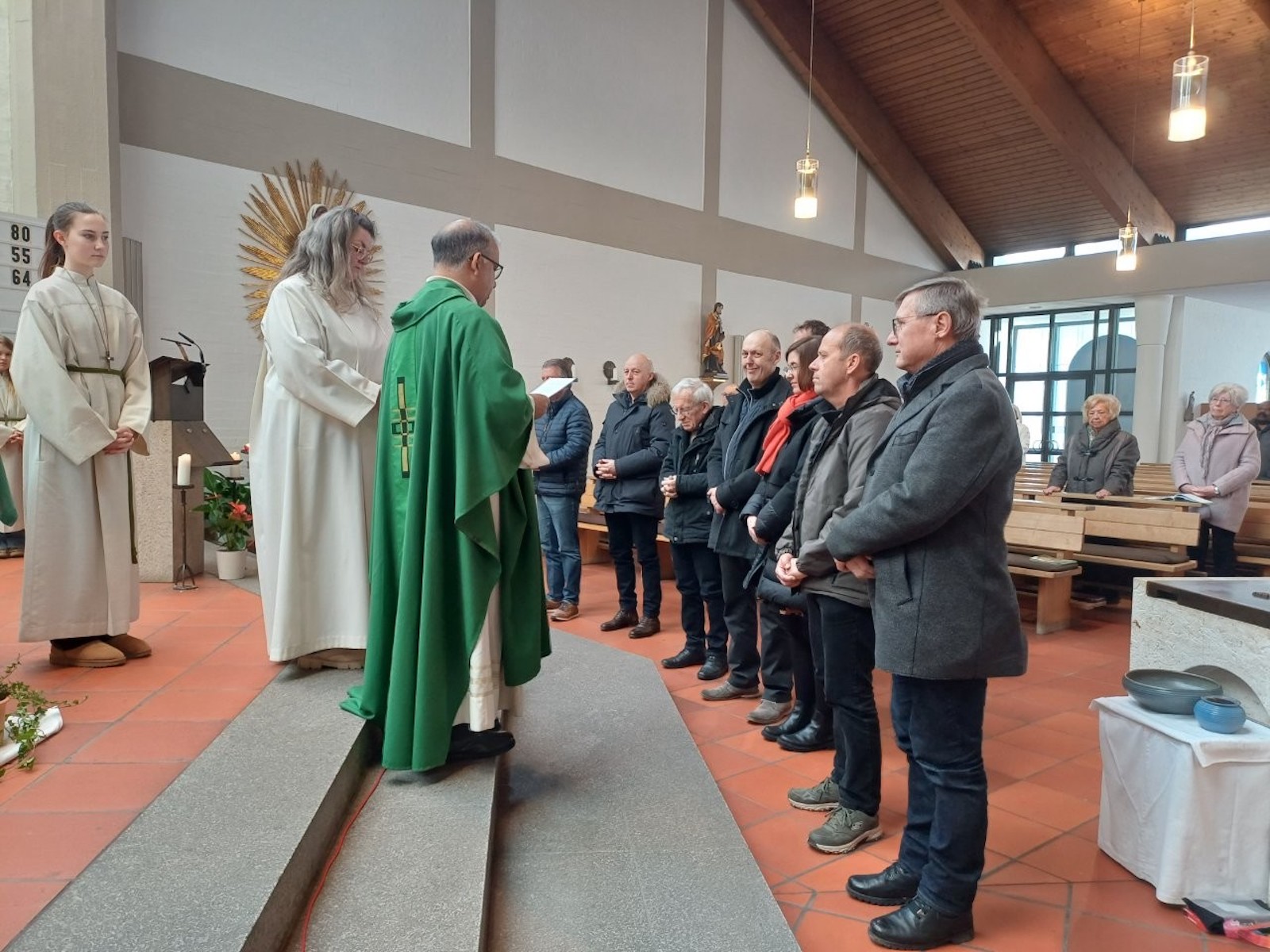 Der Chor mit Christian Breu und Norbert Schipp begeisterte mit Gesang und instrumentalen Tönen die Gottesdienstbesucher. Dazu erklärte die Gemeindereferentin Karin Beimers, dass jede Pfarrei immer viele Ehrenamtliche und Mitwirkende brauche. Dazu gehören auch Chöre und Kirchenverwaltungen, deren Mitglieder daraufhin persönlich vorgestellt worden sind.