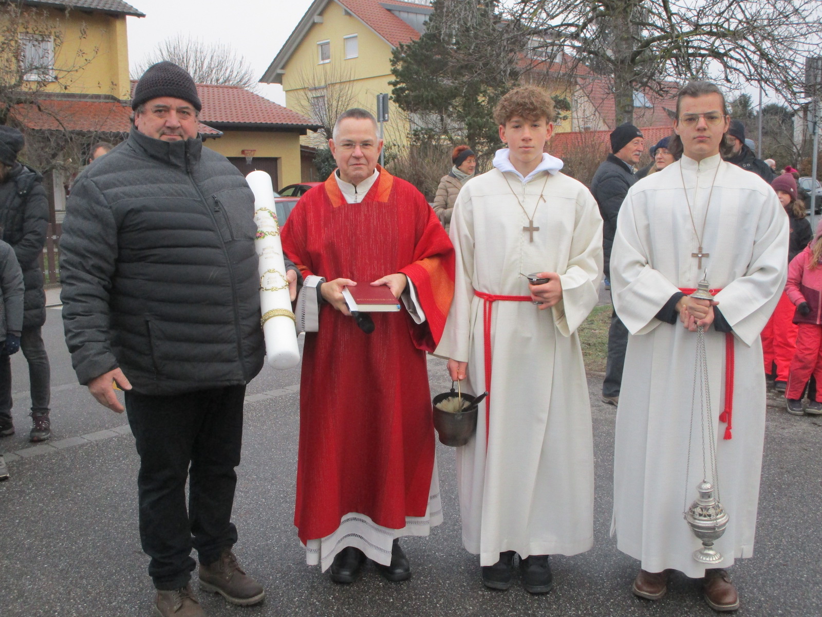 Diakon Michael Weigl schilderte zunächst, assistiert von zwei Ministranten, im Beisein von Schaulustigen den großen Stellenwert der Pferde für unsere Vorfahren, um dann seine Gebete zu sprechen und die Tiere und Reiter mit Weihwasser und Weihrauch zu segnen. Dabei verband er seine Gebete auch mit dem Wunsch, dass alle Reiter und Vierbeiner ganzjährig unfallfrei bleiben mögen.